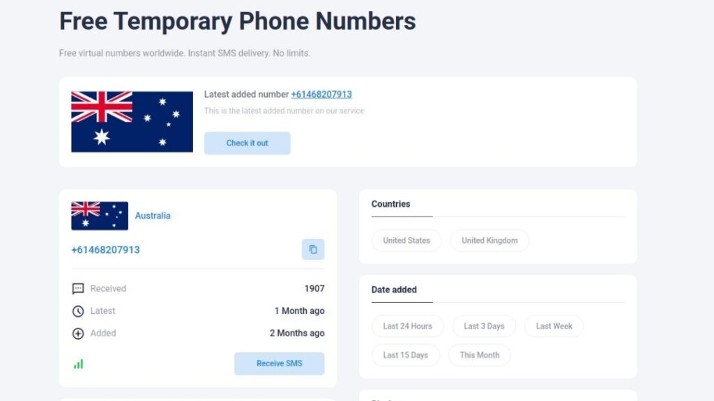 سایت ( کلیک کنید ) شماره تلفن های جدیدی از 2 کشور را به صورت رایگان در اختیار کاربران قرار می دهد. در حال حاضر، این وب سایت از شماره تلفن کشورهایی مانند آمریکا و کانادا پشتیبانی می کند. این سایت هر 2 هفته یک بار شماره ها را تغییر می دهند. بنابراین بیشترین آنها سالم باقی می باشند.